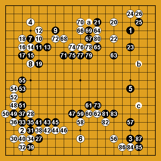 Noir prend maintenant l'initiative sur le bord nord. 63 et 65 montrent une ferme opiniâtreté pour le territoire central. 66 manque de fermeté: il aurait été meilleur de coiffer la pierre noire en 'a'. 67 est mauvais et devrait être joué en 76. Blanc doit cependant connecter et suivre le dia. 6. 68 est démesuré mais 71 est tiède. La connexion en l du dia. 7 est absolument sente.