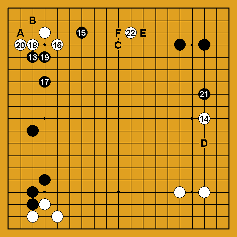 B22 : Le meilleur point sur le bord Nord. Si blanc joue plus à droite en "E" , Noir peut s'étendre naturellement en "F" et se retrouverait en sandwich entre deux positions fortes ; s'il jouait en "F", Blanc serait plus offensif contre N15 mais Noir s'étendrait simplement en "E" ce qui lui procurerait un large territoire dans le coin sans condamner vraiment sa pierre N15.