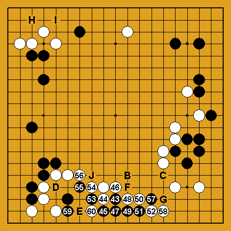 B60 : Noir pourrait alors sauver ses hommes en jouant un kô en "E", car il a plus de menace que Blanc. La coupe en "F" lui donnerait 3 menaces et l'attaque des pierres 52 et 58 en "G" lui en donne également 2. De plus il a deux menaces contre le coin en haut à gauche avec "H" et "I". Cependant Blanc aurait certainement récupéré un bon nombre de points quand finalement Noir capturerai la pierre 60 sans répondre à la menace que Blanc aurait fait à son coup précédent. Ainsi, Noir décide de risquer la vie de son groupe tout entier contre une possibilité de capturer une partie des chaînes qui l'entourent avec les coupes en "F" et en "J" qui si elles réussissent, ramènerait le territoire Blanc à peu de chose et assurerait à Noir la victoire.