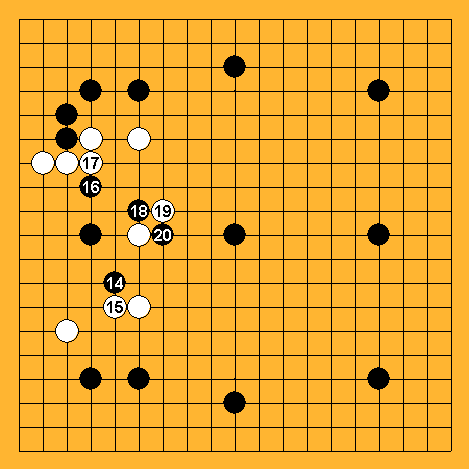 En coupant en 20 Noir a agi sans réfléchir ; il aurait du s'étendre avec 1 du Dia. 17. Dia. 17 : Noir n'a alors aucune difficulté à s'échapper. |