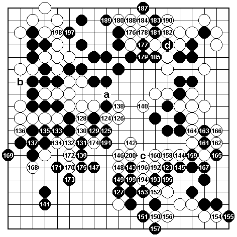 Dia. 21 Dia. 21: Black obtains a huge area up to 8. White 40: Cannot play any move to live in the lower left corner, because Black 40 after Black 'a', White 'b' ; will choke White's throat. White 50 ...56 : Preparation for 58. Black 59: If Black 60 instead, then White will play 'c'. The middle Black group was in the siege of White. It was White's success. |