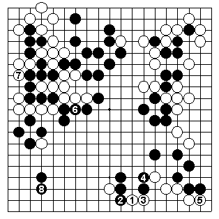 Fig. 4. ( 123-200 ) Black 23: Necessary to capture White's group at the lower side, White 24: While will play according to Black's reply. Any special move of White's at the lower side may endanger White's group there, or when White tries to live, Black can secure a vast territory and win the game. ( See Dia. 21)