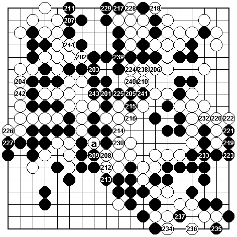 Fig. 5. (201-244) Black 11: Fatal mistake. Any other move could lead Black to victory. Dia. 22: After 244, if Black moves at '1' there will be a ko fight but he has no more kodate and White takes ko at '21' to finish the game. Since Black can do nothing but to fill dame White does not need to continue at '21'. This is what Go-Seigen believes. However, the Go rule established some months previously says when there is ko effective by the next one move, it should be continued. So White has to connect at the point: that caused his loss by 1/2 point.