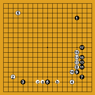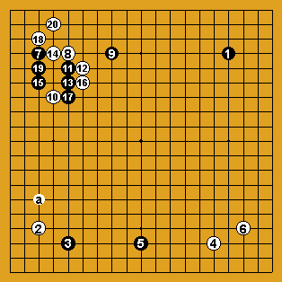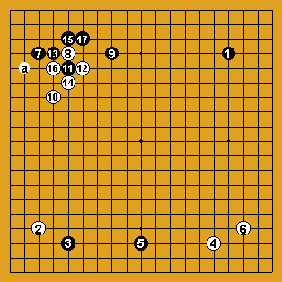 Noir aurait pu choisir la variante du dia 2 : un joseki souvent joué qui aurait été plus en harmonie avec la situation du coin Sud-Ouest. Noir aurait pu alors prendre en tenaille la pierre blanche du coin sud-ouest, en jouant le coup suivant en "a", prenant alors l'initiative globale. |