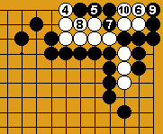 Dia. 3b Les coups 4 et 6 sont naturels pour essayer d'obtenir un seki par forme mais Noir coupe en 7 et force la capture de ses 4 pierres avec 9