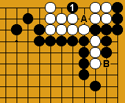 Dia. 3c Le tesuji en 1 permet de conclure malgré le damezumari noir. Il menace l'uttegaeshi en "A" le rendant miai avec "B"