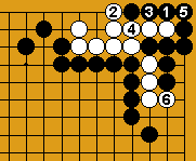 Dia. 3d Si le Noir essaye d'empêcher les 2 yeux en jouant le hane 1 dans le coin, il est victime de son manque de libertés et se fait capturer avec la séquence jusqu'en 6.