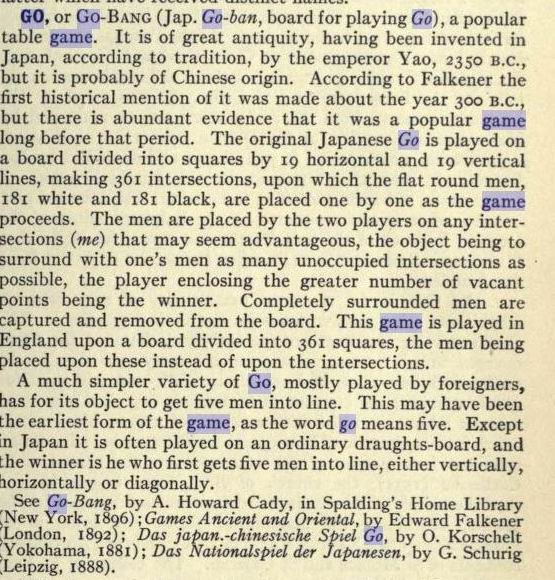 Dans la 11e édition de l'encyclopédie Britannica, on a déjà la définition du Go et du Gobang, plus connu de nos jour sous-l'appellation de Gomoku Narabé. A remarquer que l'interprétation du caractère Go qui veut dire 5 n'a, à mon avis, rien à voir avec le jeu de go qui est formé d'un autre caractère.