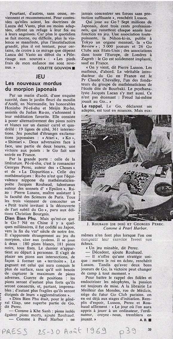 Visiblement Janvier-février 69, c'est pas ça. Je me rappelle de la quatrième de couverture du petit traité qui reprenait un morceau de l'article et qui évoquait les joueurs Perec et Roubaud pendant leur vacances d'été. Je place la bobine de Septembre-octobre. les yeux commencent à fatiguer mais rien. Je me rends compte que cela prend du temps et que je devrai bientôt rentrer si je ne veux pas arriver après nos invités à la maison. Je place la bobine de Juillet-août et en fin de bobine, le sommaire du numéro du 25-30 Août 69 : JEU, Les nouveaux mordus du morpion japonais page 38. Je crois que j'y suis mais la bobine s'arrête à la page 17. Au moteur, cela ne va pas plus loin. Trop bête. Serait-ce sur la bobine suivante. En fait, non. Je m'aperçois que l'on peut déplacer le film manuellement et les pages défilent à nouveau. 30, 31, 32... J'arrive page 38 et je sais que j'ai trouvé. 2 colonnes, je m'attendais à plus mais il ne faut pas gâcher son plaisir. Reste maintenant à obtenir une impression. J'achète une première carte pour 1 euros et 2 copies. Une fois la carte introduite, je ne trouve pas de bouton copie sur la machine. Je demande de l'aide mais en l'attendant, je fini par appuyer sur un bouton vert qui lance l'impression. Je récupère une feuille en caractères blanc sur noir peu lisible. Je diminue la luminosité... Ce coup-ci, le cadrage est mauvais et la qualité pas meilleur. Je décide d'aller racheter une carte mais je n'ai plus de monnaie. Je cherche qui va me changer mes pièces de 10 centimes en pièce de 50 et comprends enfin que je peux recharger ma carte. 3 copie pour 50 centimes d'euros. Et je repars vers la machine. L'appariteur arrive et me signale qu'un bouton permet d'inverser le négatif. Il repart et je réessaye une copie : cela ne change rien. Encore un essai et je reperds le cadrage. J'appuie à nouveau sur le petit bouton qui semble transformer le négatif en positif et je tente ma dernière cartouche. Sur l'imprimante quelle n'est pas ma joie de voir une belle copie en caractères noirs sur le fond grisé. La photo est même presque belle et l'on distingue vaguement la barbiche de Georges Perec face à Jacques Roubaud (de dos) comme à Pearl Harbour.