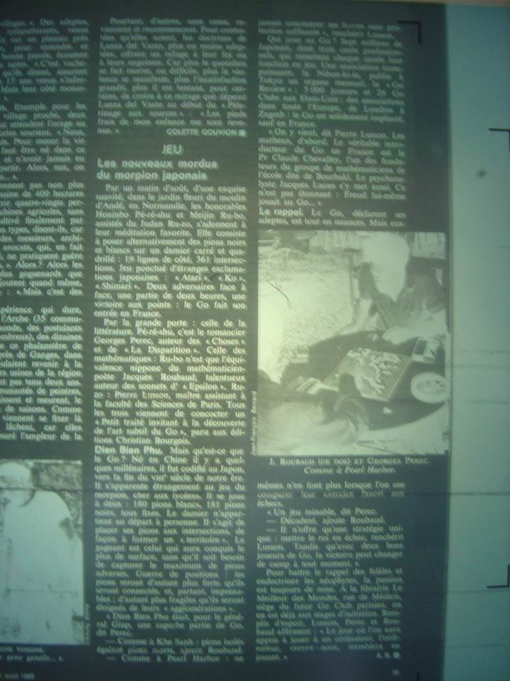 Par cette après-midi du mois de Mai 2005, je me suis décidé à retrouver le texte qui constitue le premier article sur le go dans un journal français. Bruno Deshayes, qui a découvert le jeu grâce à cet article, il y a plus de 35 ans, m'a conseillé d'aller aux archives de l'Express mais ce journal n'offre pas de salle d'archives et conseille au public de se rabattre sur les bibliothèques. Aussi ce Samedi, après une visite inutile à la BNF me voilà, comme à l'époque de ma prépa prêt à demander une carte de lecteur à la bibliothèque Sainte-Geneviève. L'endroit n'a pas changé avec un millier de places de travail numérotées, au cœur des rayons; même si l'informatique est maintenant reine. Après consultation des catalogues, L'Express Paris ne semble disponible qu'à partir de 1975 et avec des lacunes... Je me vois déjà essayer la bibliothèque de Beaubourg un jour futur... mais je fais appel à une bibliothécaire qui consulte à nouveau le catalogue. Effectivement, c'est bien ça... uniquement après 1975 et puis non l'Express est en fait disponible à partir du premier numéro (1953) sur micro-forme. Ca y est. Le document est commandée. 20 minutes après, je dispose de 6 ou 7 bobines de films 55mm et suis installé dans une petite salle avec ma première bobine sur l'appareil. Les pages commencent à défiler avec un peu de nostalgie : la lune, Georges Pompidou et tous ces noms gravées quelque part dans le fond de ma mémoire et qui réapparaissent en négatif.