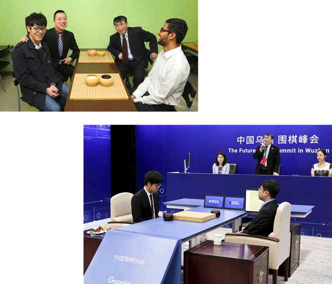 Tech; Bottom: Ke Jie (left) plays against AlphaGo, with Aja Huang as an