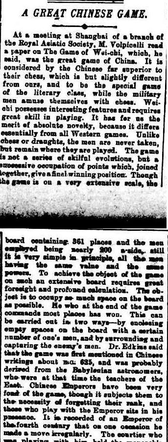 A GREAT CHINESE GAME At a meeting at Shanghai of a branch of the Royal Asiatic Society, M. Volpicelli read a paper on The Game of Wei-chi, which, he said, was the great game of China. It is considered by the Chinese far superior to their chess, which is but slightly different from ours, and to be the special game of the literary class, while the military men amuse themselves with chess. Wei-chi possesses interesting features and requires great skill in playing. It has for us the merit of absolute novelty, because it differs essentially from all Western games. Unlike chess or draughts, the men are never taken, but remain where they are played. The game is not a series of skilful evolutions, but a successive occupation of points which, joined together, give a final winning position. Though the game is on a very extensive scale, the board containing 361 places and the men employed being nearly 200 a-side, still it is very simple in principle, all the men having the same value and the same powers. To achieve the object of the game on such an extensive board requires great foresight and profound calculation. The object is to occupy as much space on the board as possible. He who at the end of the game commands most places has won. This can be carried out in two ways -by enclosing empty spaces on the board with a certain number of one's men, and by surrounding and capturing the enemy's men. Dr. Edkins said that the game was first mentioned in Chinese writings about BC 625, and was probably derived from the Babylonian astronomers, who-were at that time the teachers of the East. Chinese Emperors have been very fond- of the game, though it subjects them to the necessity of forgetting their rank, and those who play with the Emperor sits in his presence. It is recorded of an Emperor of the fourth century that on one occasion he made a move irregularly. The courtier who was playing with him held the monarch's finger, and the- Emperor was not offended. This was thought important enough to be mentioned in history.