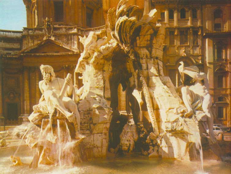 | La Fontaine des quatre rivières sur la Piazza Navona de Bernini 1648-51 qui représente les quatre continents et leurs rivières, l'obélisque dans le centre est le symbole du Christ et de l'Église Catholique triomphant sur le monde entier. |