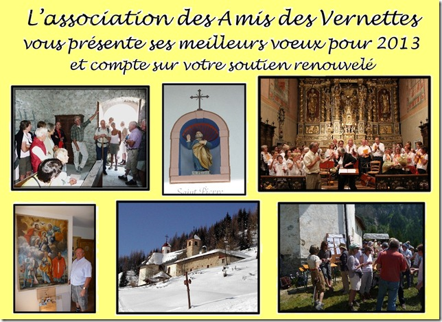 Nous poursuivrons en 2013, avec votre soutien et votre concours renouvelés, tous nos efforts pour l'entretien, la restauration, et l'animation de N.D. des Vernettes et des autres sanctuaires de notre chère vallée de Peisey-Nancroix.