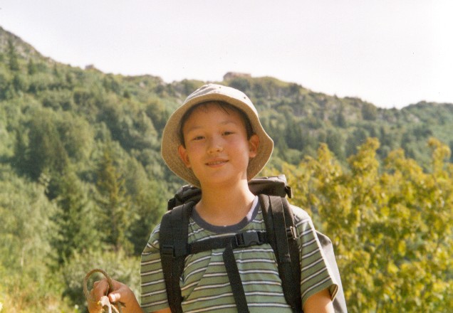 On remonte quelques névés, qui nous permettent de tester nos crampons. La neige est encore dure et la pente peu raide ce qui permet aux enfants de se familiariser avec la technique du cramponnage. Les pieds sont serrés dans les chaussures et Thomas a froid aux pieds.