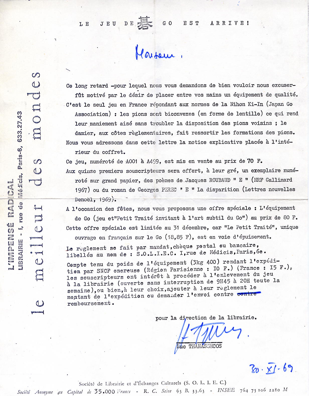 | Un des premiers jeu de go vendu en France et ajout dans l'histoire du Go en France | 14/01/2007 |